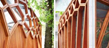 The client has a sensitivity to insects, so special screen was necessary to fill the mahogany cells. The structure supports a glass canopy which is made from a patterned, laminated-tempered glass, allowing light to come through, while still providing privacy due to its water-like pattern. The resulting space provides a sheltered outdoor experience, with space for yoga, dining, reading, and outdoor sleeping